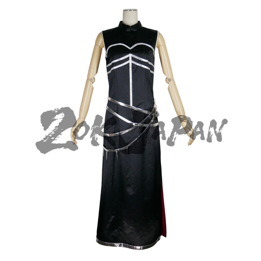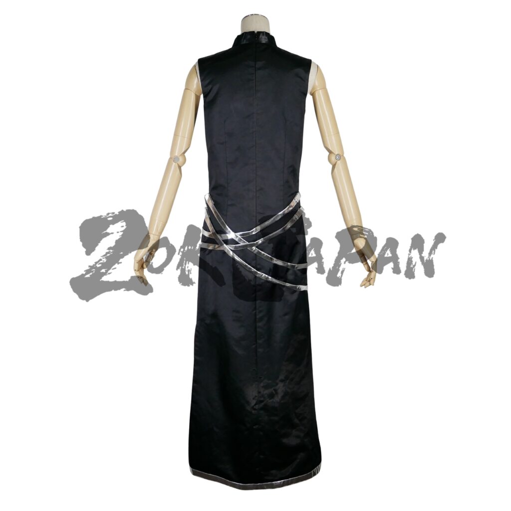 ワンピースはチャイナドレスの形をベースとして製作し、シルバーの模様とや腰ベルト、アクセサリーを縫い付けました。